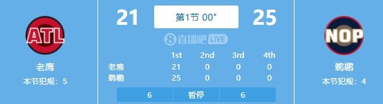 11月23日讯 NBA常规赛,鹈鹕首节25-21领先老鹰。